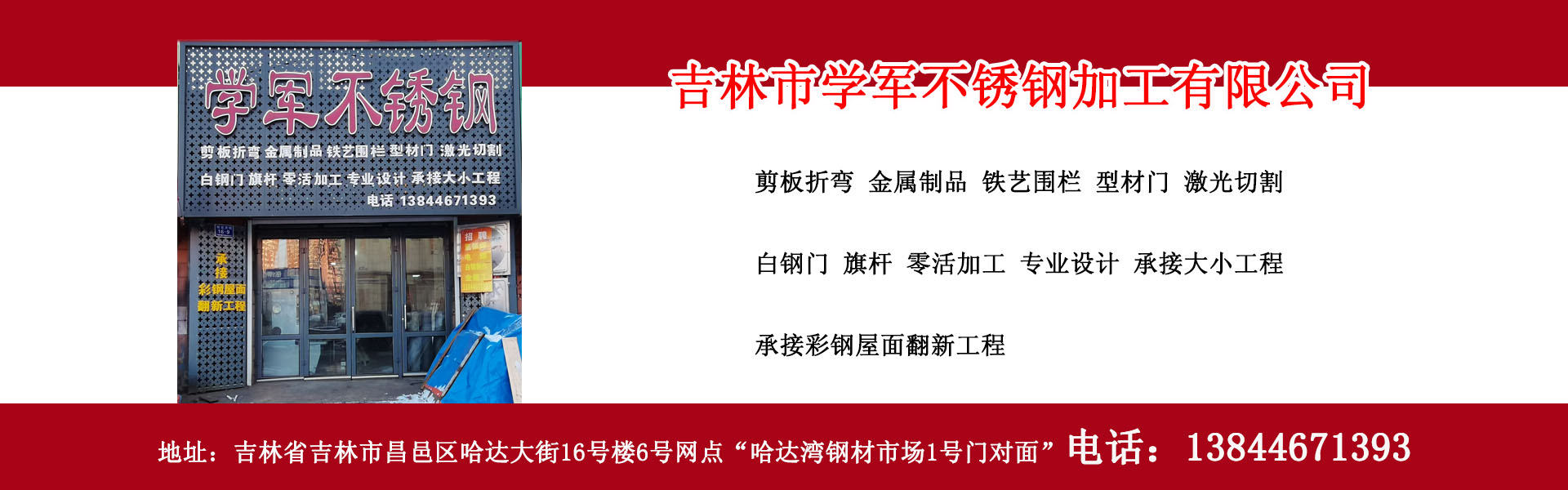 吉林市學軍不銹鋼加工有限公司專業(yè)從事吉林市不銹鋼加工制作、吉林市白鋼門制作、吉林市白鋼隔斷制作、吉林市剪板折彎、激光切割、型材門、電子感應(yīng)門、旗桿制作、彩鋼屋面翻新、吉林市鐵藝圍欄加工制作等吉林市不銹鋼加工制作、吉林市金屬加工制作服務(wù)單位,位于吉林省吉林市。